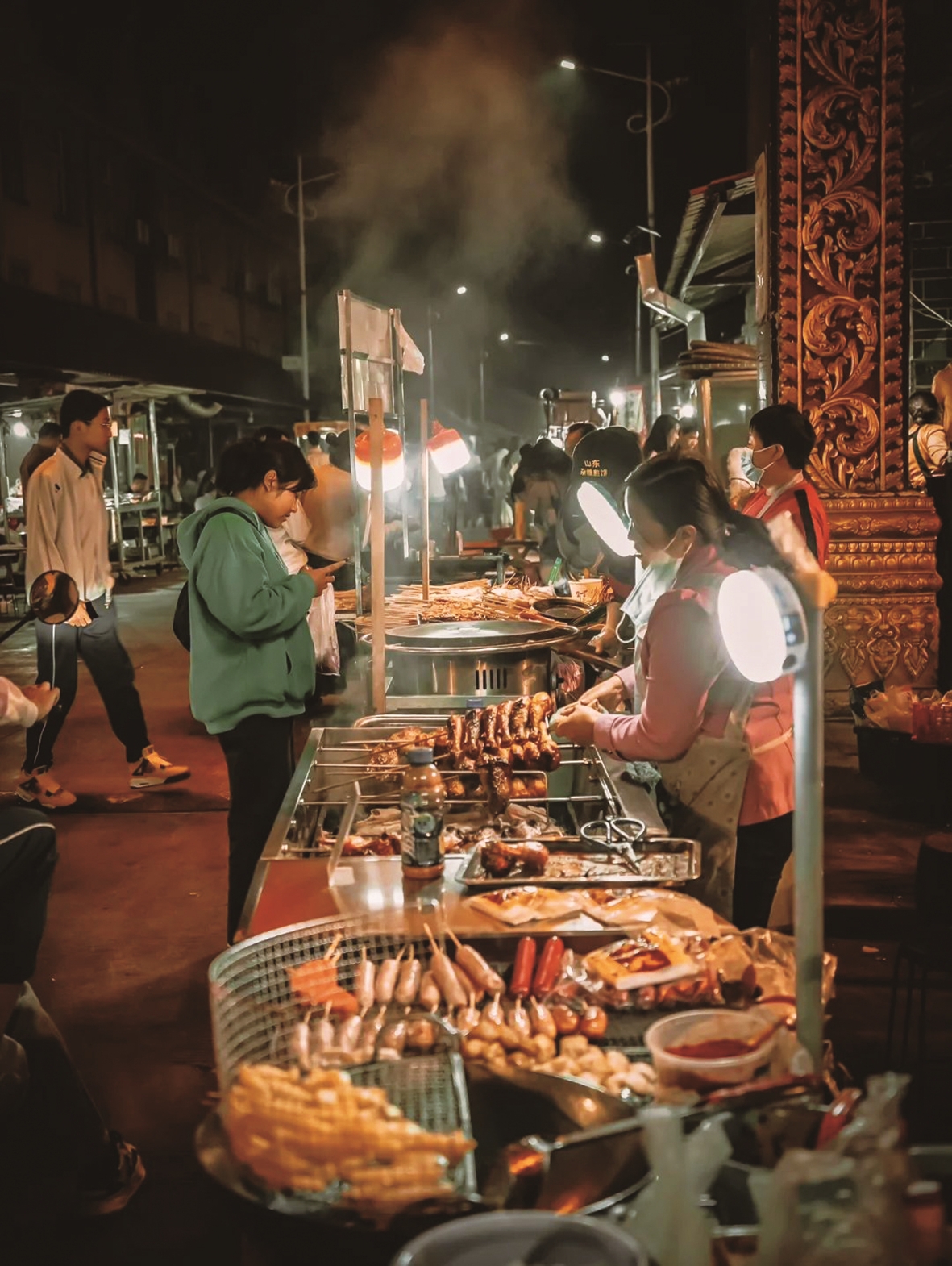 這里的小吃攤,是年味的靈魂——傣味涼拌的酸辣、粑粑卷的糯香、烤豬蹄的焦脆,每一道風(fēng)味都裹著鄉(xiāng)愁的溫度,成為游子心中那條回不去的故鄉(xiāng)巷。