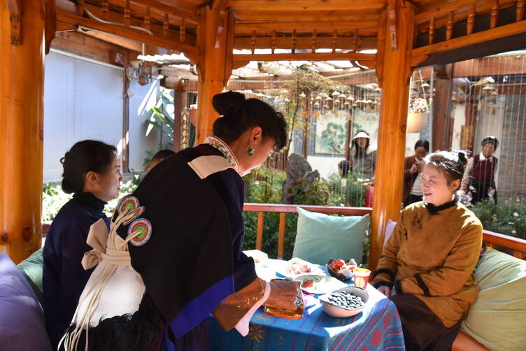 她和家人一起將精心制作的納西甜品一一擺上桌,與大院里的租客們一同分享。來自山西的張容菥,已是在麗江生活八年的新麗江人,第一次來麗江,她便被古城院落、小橋流水、藍天白云以及“20度的麗江”的慢生活深深吸引,于是就此扎根成為客棧經營者。品嘗到地道的納西咕谷后,她忍不住贊嘆這份甜品的精致與美味,更為納西民族的生活智慧與文化底蘊深深折服。對無數像張容菥一樣奔赴麗江的人而言,這座古城不僅有慢時光,更有藏在煙火里的文化溫度。