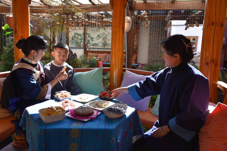 一家人與客棧經營者張容菥一起分享著納西甜品(2026年2月5日攝)