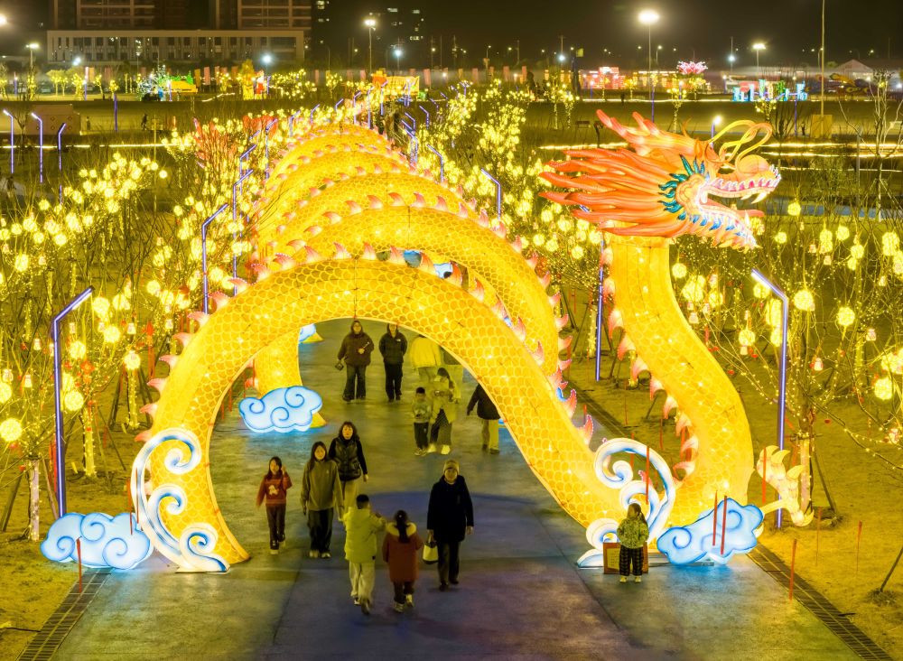 ↑ 2月14日,市民在江蘇省興化市蓮溪湖公園賞燈游玩(無人機拍照)。新華社發(fā)(周社根 攝)