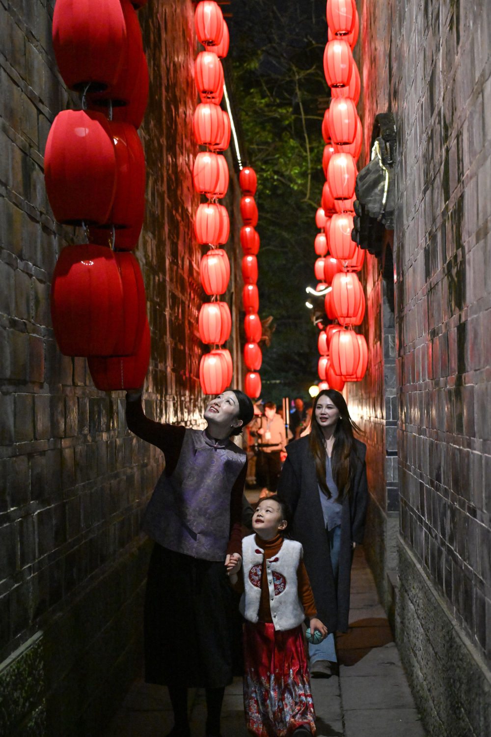 ↑ 2月14日,人們在浙江衢州古城文化旅游區(qū)水亭門歷史文化街區(qū)賞燈游玩。新華社發(fā)(謝丹攝)