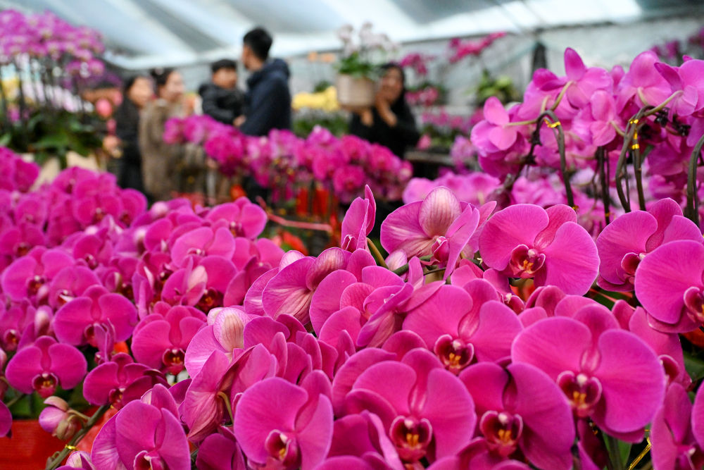 ↑ 2月15日,人們在河南省商丘市睢陽大道一處花卉市場選購鮮花。新華社發(fā)(李恒攝)