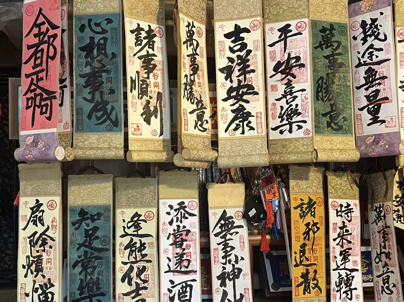 王建宇:25年的回頭客比較多,他來過,在我這現(xiàn)場買了幾副,回去以后又跟我這訂做,這是自覺喜樂,這是給人設(shè)計的。這是給人家八十壽的老人,給他(寫的)藏頭詩。還有喜牌,就是人結(jié)婚寫的合體字,喜上眉梢,龍鳳呈祥,珠聯(lián)璧合,雙喜臨門。年底寫對聯(lián)的還有擺臺(特別多),一定百十來個,當(dāng)伴手禮。