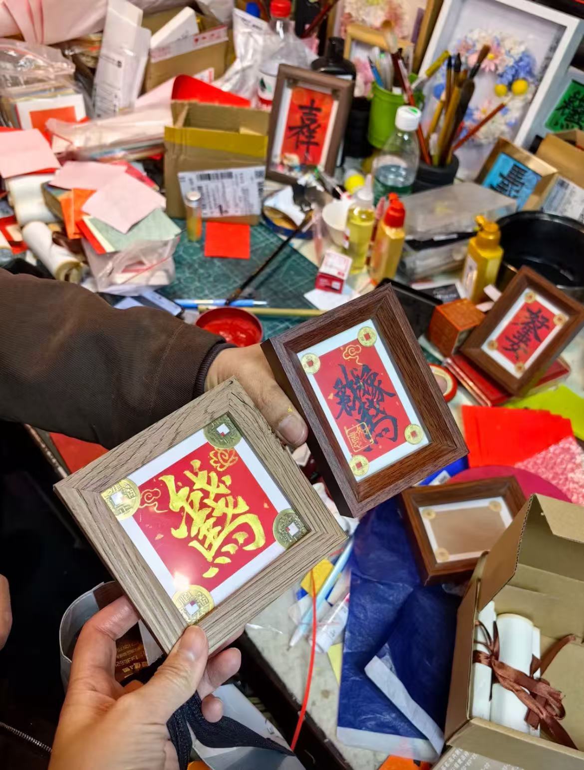 十平方左右的小店里,墻上、桌上,毛筆、自制卷軸、擺臺,滿滿當(dāng)當(dāng)。店主王建宇正伏在案頭,手握毛筆,筆尖蘸飽了墨汁,在灑金紅紙上落下最后一筆。
