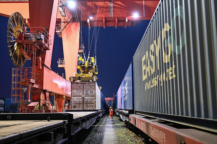 貨運(yùn)員在成都國際鐵路港檢查吊運(yùn)的中歐班列集裝箱(2026年2月16日攝)。新華社發(fā)(何海洋 攝)