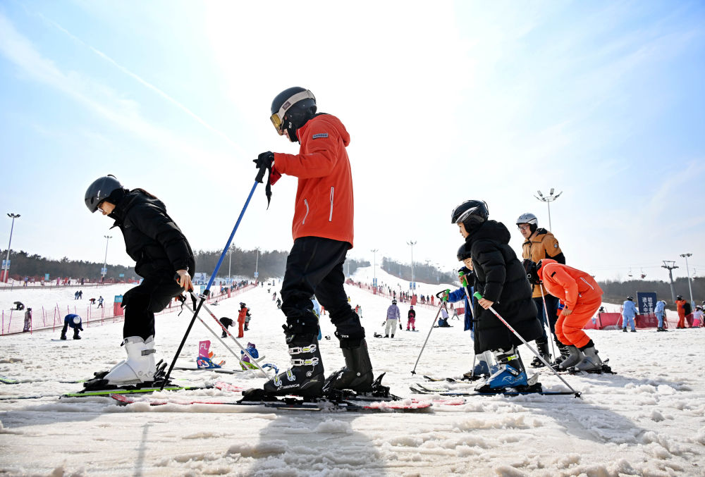 2月13日,游客在青島西海岸新區(qū)融創(chuàng)藏馬山滑雪場(chǎng)學(xué)習(xí)滑雪。當(dāng)?shù)匾浴氨?文化”“冰雪+旅游”聚人氣、促消費(fèi)、添年味。新華社記者 李紫恒 攝