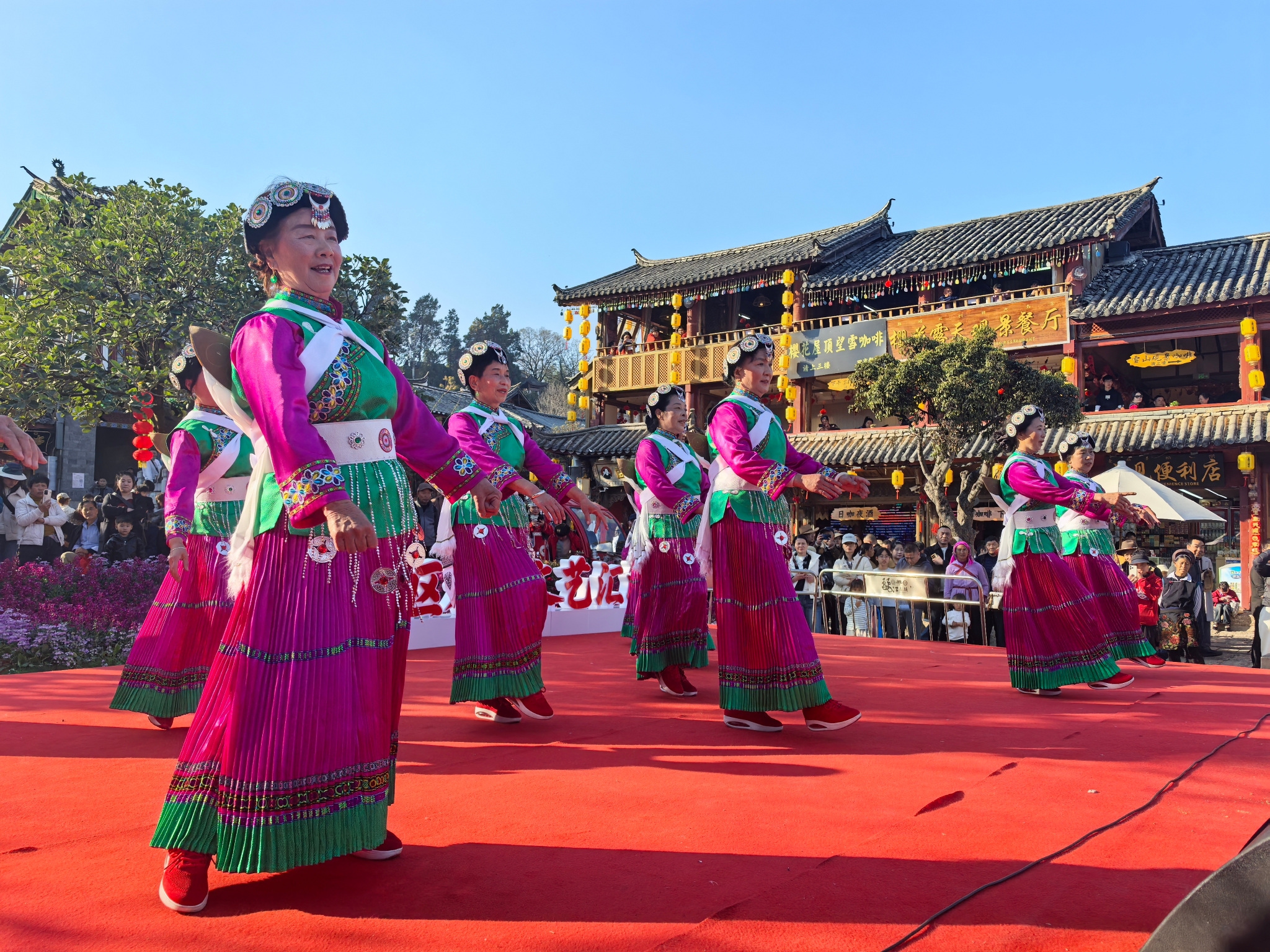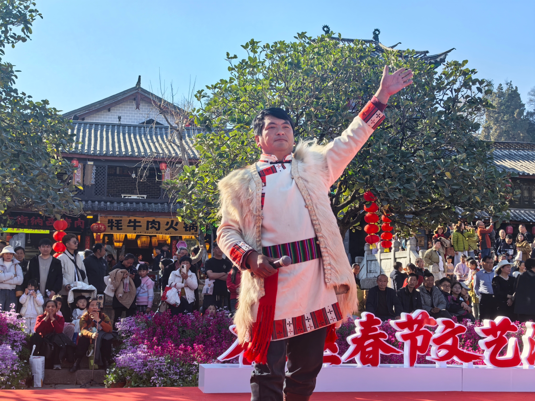 春節(jié)期間,麗江古城景區(qū)開展“喜迎新春”歌舞展演,為八方游客和市民獻(xiàn)上一場(chǎng)富有民族特色的文化盛宴,讓古城年味更濃、新春氛圍更足。