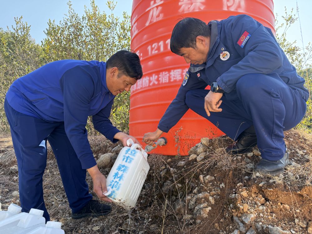 在南堯卡點(diǎn),隊(duì)員們逐一對(duì)進(jìn)山車輛后備箱、車廂進(jìn)行篩查,確認(rèn)無(wú)易燃物后放行;在護(hù)林防火觀測(cè)點(diǎn),他們沿著防火隔離帶來(lái)回巡邏,目光緊盯林區(qū)動(dòng)向,俯身檢查森林消防蓄水桶水位?!澳蠄蜻@個(gè)點(diǎn)地勢(shì)比較高,視野開(kāi)闊,所以我們把這個(gè)點(diǎn)設(shè)為護(hù)林防火觀測(cè)點(diǎn),春節(jié)期間防火形勢(shì)比較嚴(yán)峻,我們一般每天都來(lái)2至3趟?!备标?duì)長(zhǎng)沙學(xué)杰介紹。