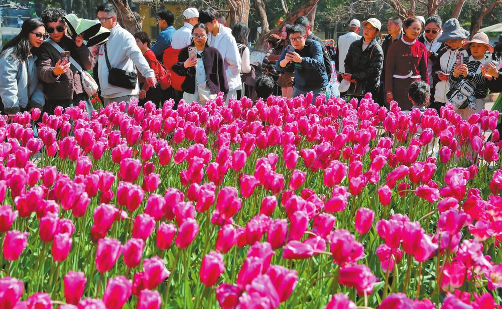 春節(jié)期間,昆明翠湖公園舉辦第十四屆郁金香花展,各色郁金香連綴如織,鋪成綿延花毯。八方游客紛至沓來,賞花觀景,共賀新春。 記者 楊崢 攝