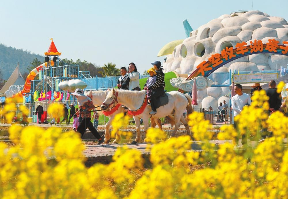 近日,安寧螳螂川的油菜花迎來盛花期,吸引眾多市民游客前來踏春賞花。游客們或悠然漫步,或騎馬漫游于田野之間,盡享愜意的田園時(shí)光。 記者 黃興能 攝