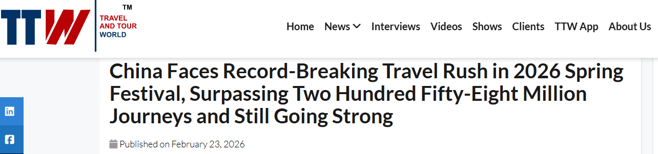 美國《旅行和旅游世界》網(wǎng)站2月23日報道稱,2026年中國春運(yùn)進(jìn)入返程高峰階段,出行規(guī)模持續(xù)擴(kuò)大,今年春運(yùn)必將再次書寫中國交通發(fā)展的新篇章。