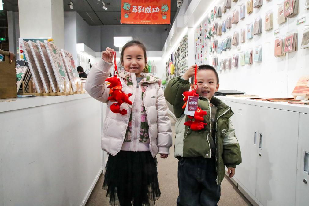 1月26日晚,在甘肅省博物館文創(chuàng)商店,小朋友展示剛購(gòu)買的新款馬踏飛燕賀歲毛絨玩偶“紅運(yùn)當(dāng)頭馬”。新華社記者 郎兵兵 攝