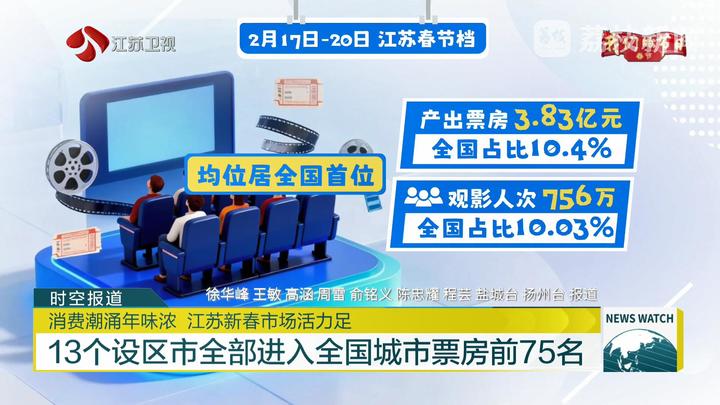 電影票房是文化消費(fèi)活力的風(fēng)向標(biāo)。截至目前,全國春節(jié)檔電影總票房已突破40億元。作為全國票倉,江蘇電影市場(chǎng)持續(xù)領(lǐng)跑全國:2月17日至20日,江蘇產(chǎn)出票房超3.83億元,全國占比10.4%;觀影人次超756萬,全國占比10.03%,票房和人次均位居全國首位。放眼全國,江蘇展現(xiàn)出“萬馬奔騰”的票房趨勢(shì),13個(gè)設(shè)區(qū)市全部進(jìn)入全國城市票房前75名,蘇州、南京、南通、無錫、鹽城五市進(jìn)入全國前20名。