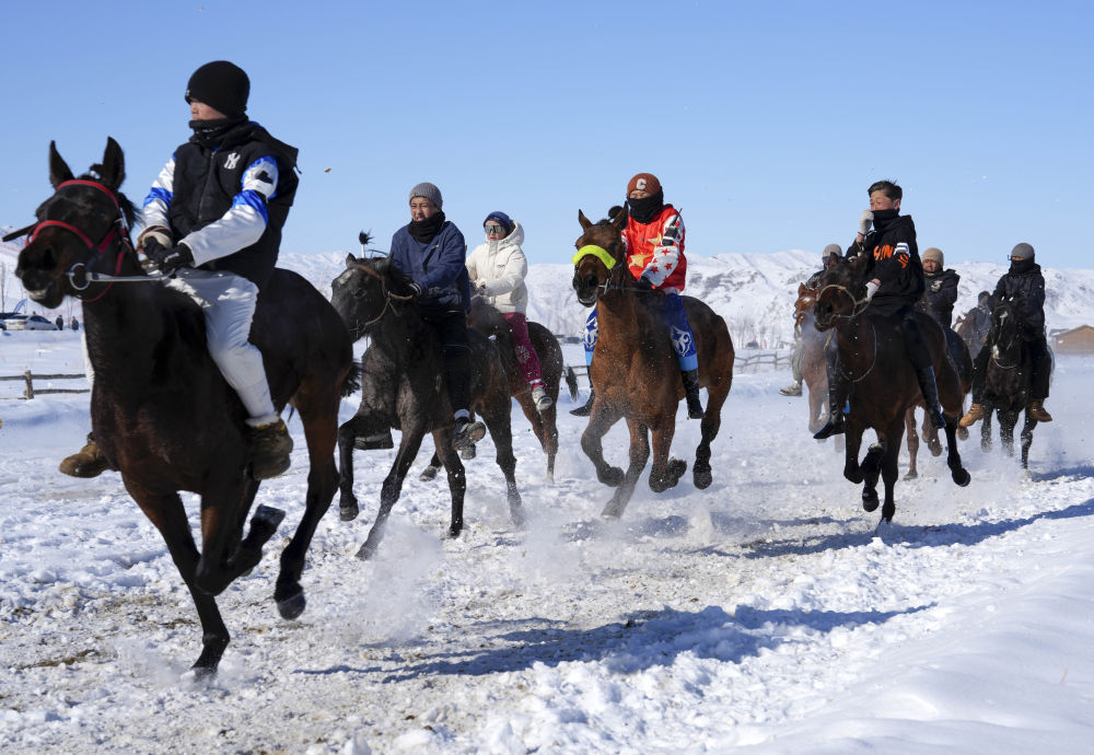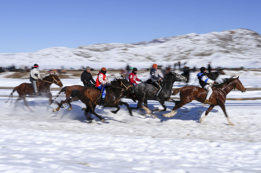 在新疆青河縣狼山景區(qū)賽馬場,當(dāng)?shù)厝罕婇_展賽馬活動歡度新春佳節(jié)(2月17日攝)。新華社發(fā)(葉爾江·木哈買提 攝)