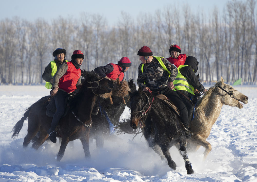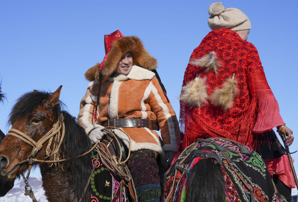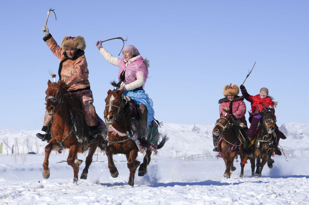 在新疆青河縣狼山景區(qū)賽馬場,當(dāng)?shù)厝罕妳⑴c馬上運動“姑娘追”歡度新春佳節(jié)(2月17日攝)。新華社發(fā)(葉爾江·木哈買提 攝)