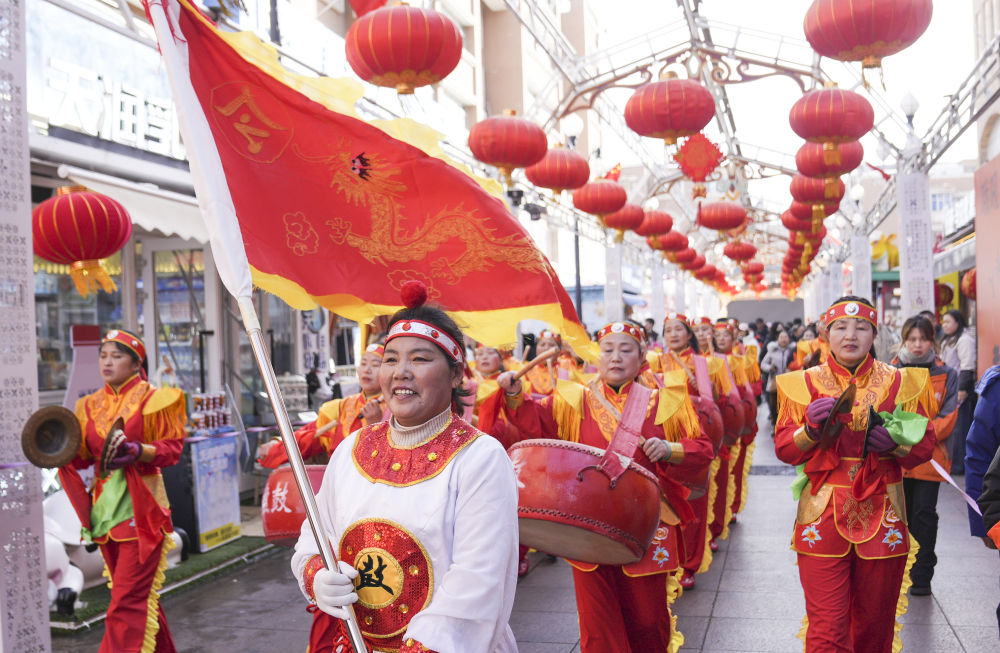 在烏魯木齊大巴扎步行街,人們在參加社火表演(2月20日攝)。新華社發(fā)(李嘉華 攝)