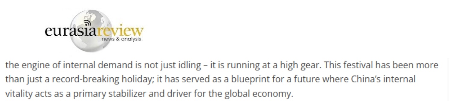 文章最后說(shuō),春節(jié)消費(fèi)熱潮表明,內(nèi)需引擎非但沒有空轉(zhuǎn),反而在高速運(yùn)轉(zhuǎn)。這個(gè)春節(jié)的意義不僅僅在于其破紀(jì)錄的假期數(shù)據(jù),而是在于它繪制了一幅未來(lái)藍(lán)圖:中國(guó)的內(nèi)在活力將成為全球經(jīng)濟(jì)的主要穩(wěn)定器和驅(qū)動(dòng)力。