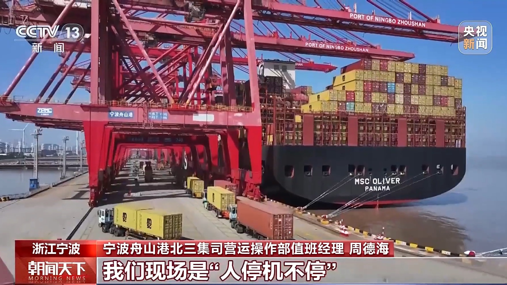寧波舟山港北三集司營運操作部值班經(jīng)理 周德海:這條船載重量超過了19萬噸,這回在我們港區(qū)的作業(yè)量超過了兩萬標準箱,像這樣的船型,整個春節(jié)期間還是比較多的。這幾天出口箱量增長比較明顯,我們現(xiàn)場是“人停機不?!?。節(jié)后的第一波出口集中,客戶都希望搶時間、趕船期,我們也爭分奪秒確保貨物能及時出運。