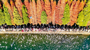 圖為2025年12月10日,游客在云南省昆明市滇池畔的海洪濕地公園喂紅嘴鷗(無人機(jī)照片)。 新華社文/圖