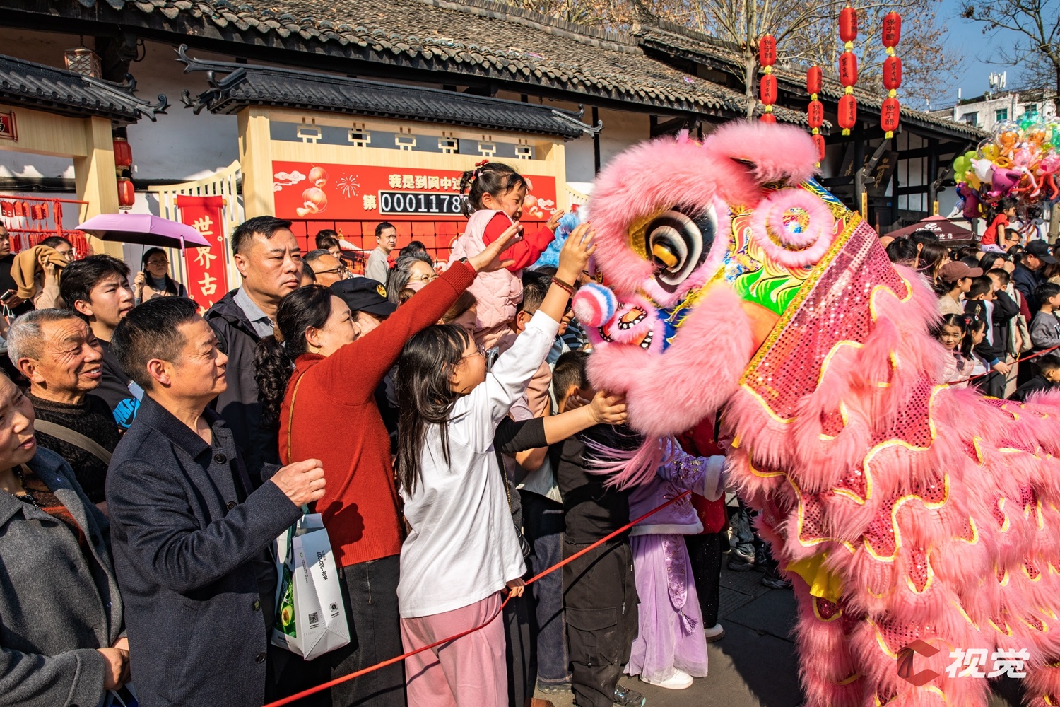 2月21日,南充市閬中古城,游客們與“醒獅”互動。