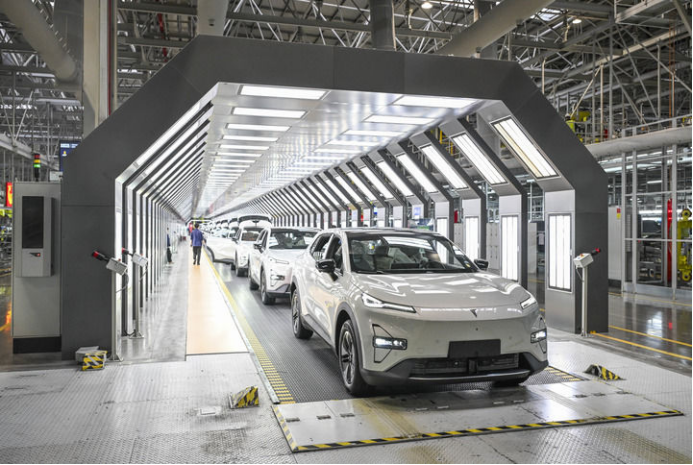 這是2025年1月9日在位于重慶市渝北區(qū)的長安汽車數(shù)智工廠總裝車間拍攝的即將下線的新能源汽車。新華社記者 王全超 攝