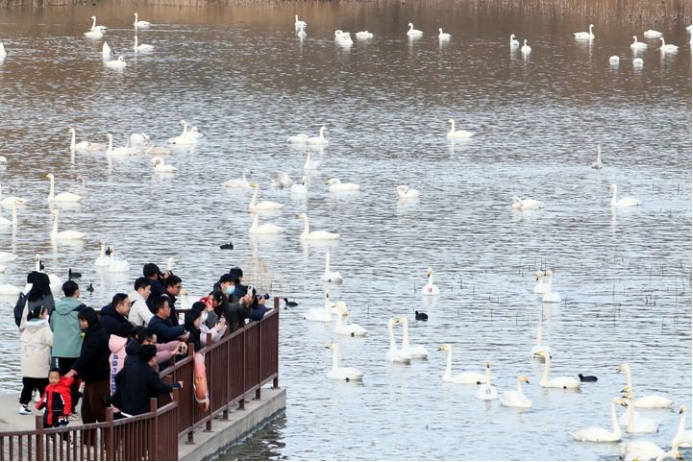 2025年12月20日,游人在河南省三門峽市天鵝湖國家城市濕地公園觀賞天鵝。新華社發(fā)(牛書培 攝)