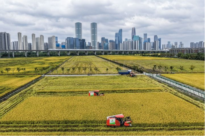 2025年10月21日,收割機在浙江省杭州市蕭山區(qū)世紀(jì)田園糧食功能區(qū)的稻田里收割水稻,遠(yuǎn)處高鐵列車飛馳而過(無人機照片)。新華社記者 徐昱 攝
