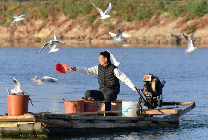2025年12月10日,福建省漳州市佛曇鎮(zhèn)東坂村河豚養(yǎng)殖戶在給河豚投喂食物。新華社記者 魏培全 攝