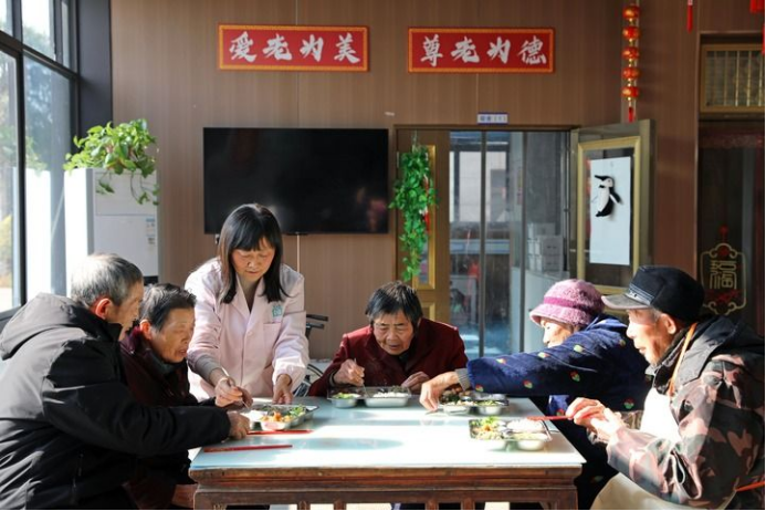 2025年12月28日,護理人員在江蘇省海安高新區(qū)隆政街道德興村親上親養(yǎng)老小院照顧老人用餐。新華社發(fā)(顧彬斌 攝)