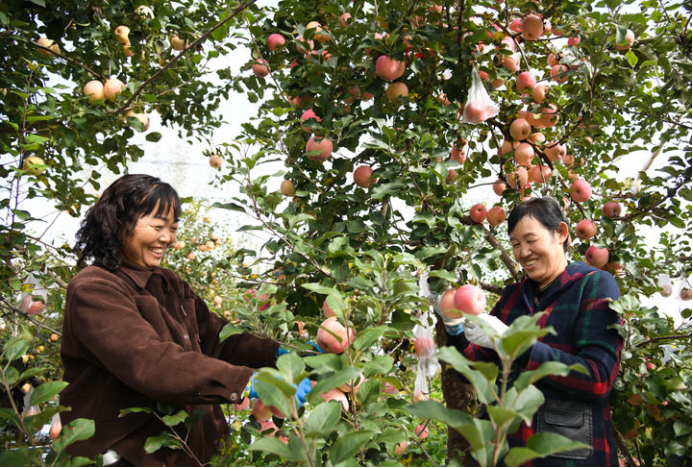 2025年10月17日,果農(nóng)在陜西省延安市寶塔區(qū)橋溝街道煙洞溝村采收蘋果。新華社記者 張博文 攝
