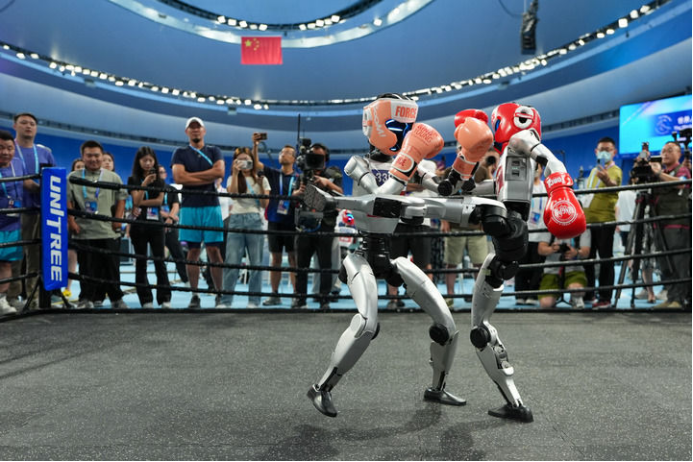 2025年8月15日,在北京國家速滑館“冰絲帶”舉行的2025世界人形機器人運動會上,來自奧林1隊的人形機器人(右)和北科/武漢大學(xué)聯(lián)隊的人形機器人在自由搏擊賽比賽中。新華社記者 鞠煥宗 攝