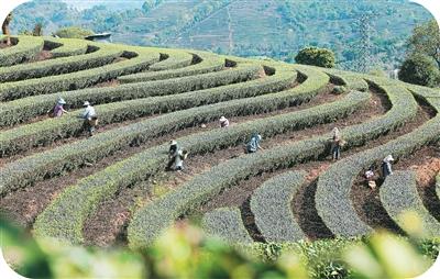 近日,在云南省普洱市寧洱哈尼族彝族自治縣寧洱鎮(zhèn)溫泉村,茶壟隨山勢起伏。