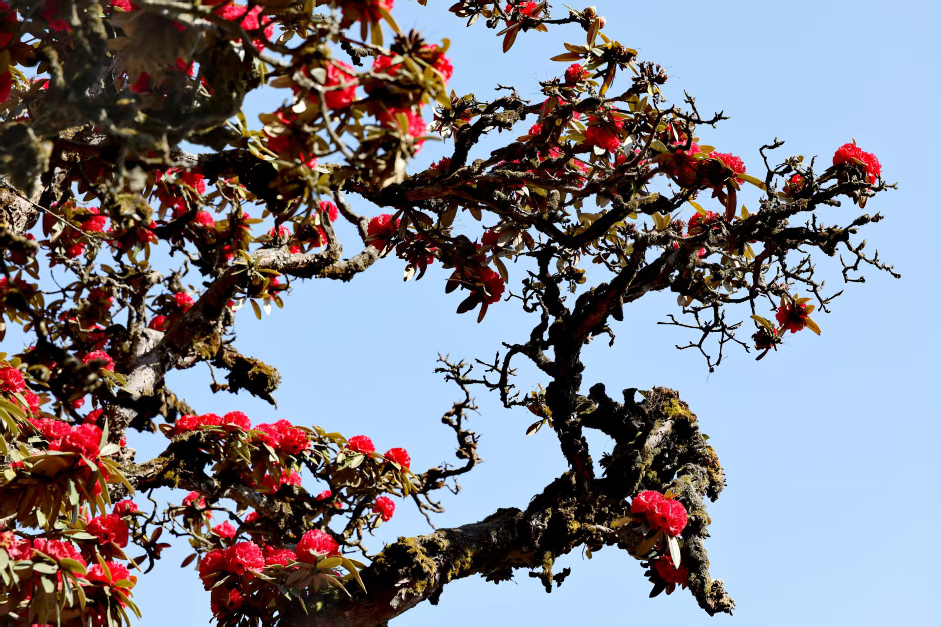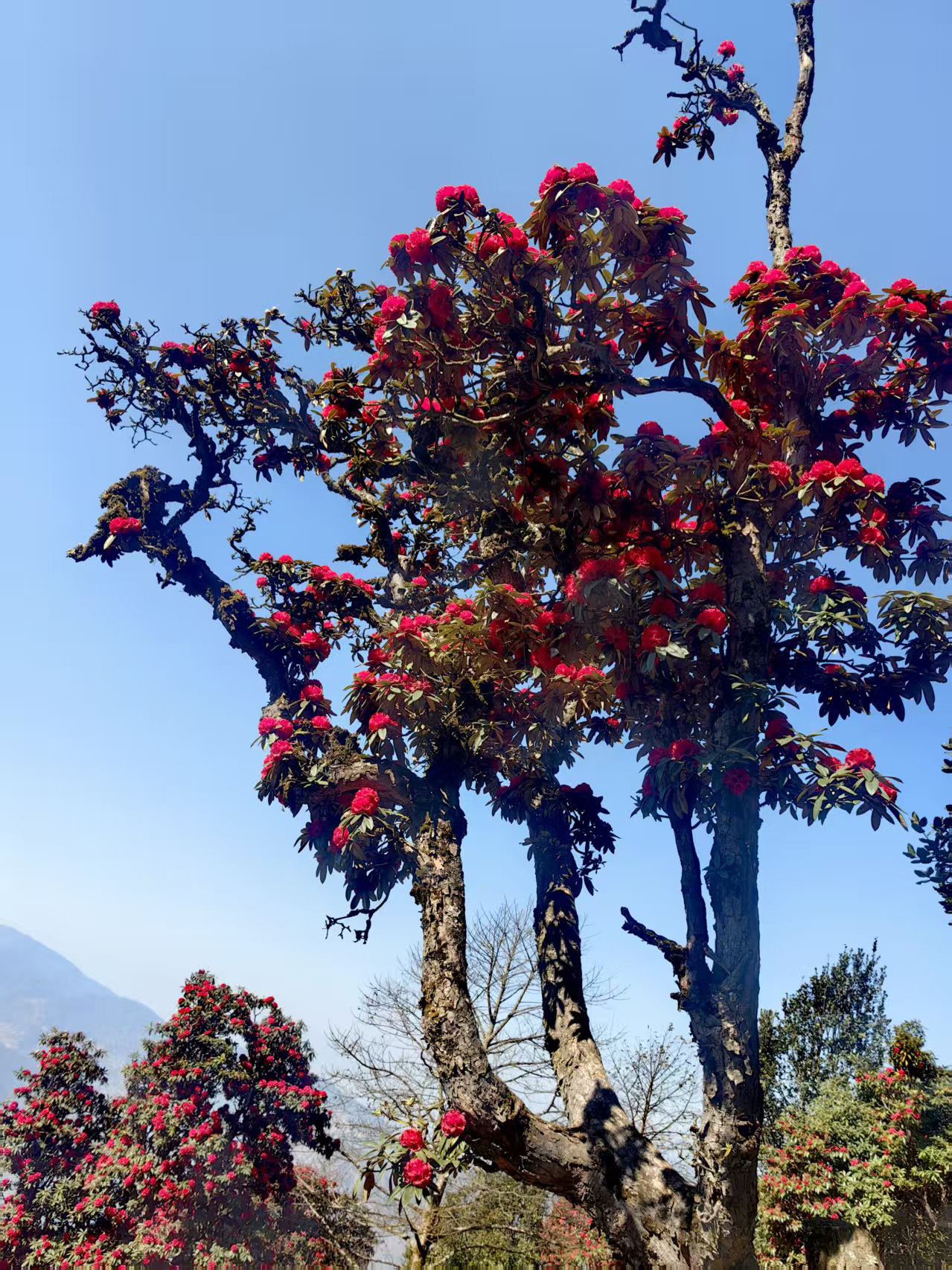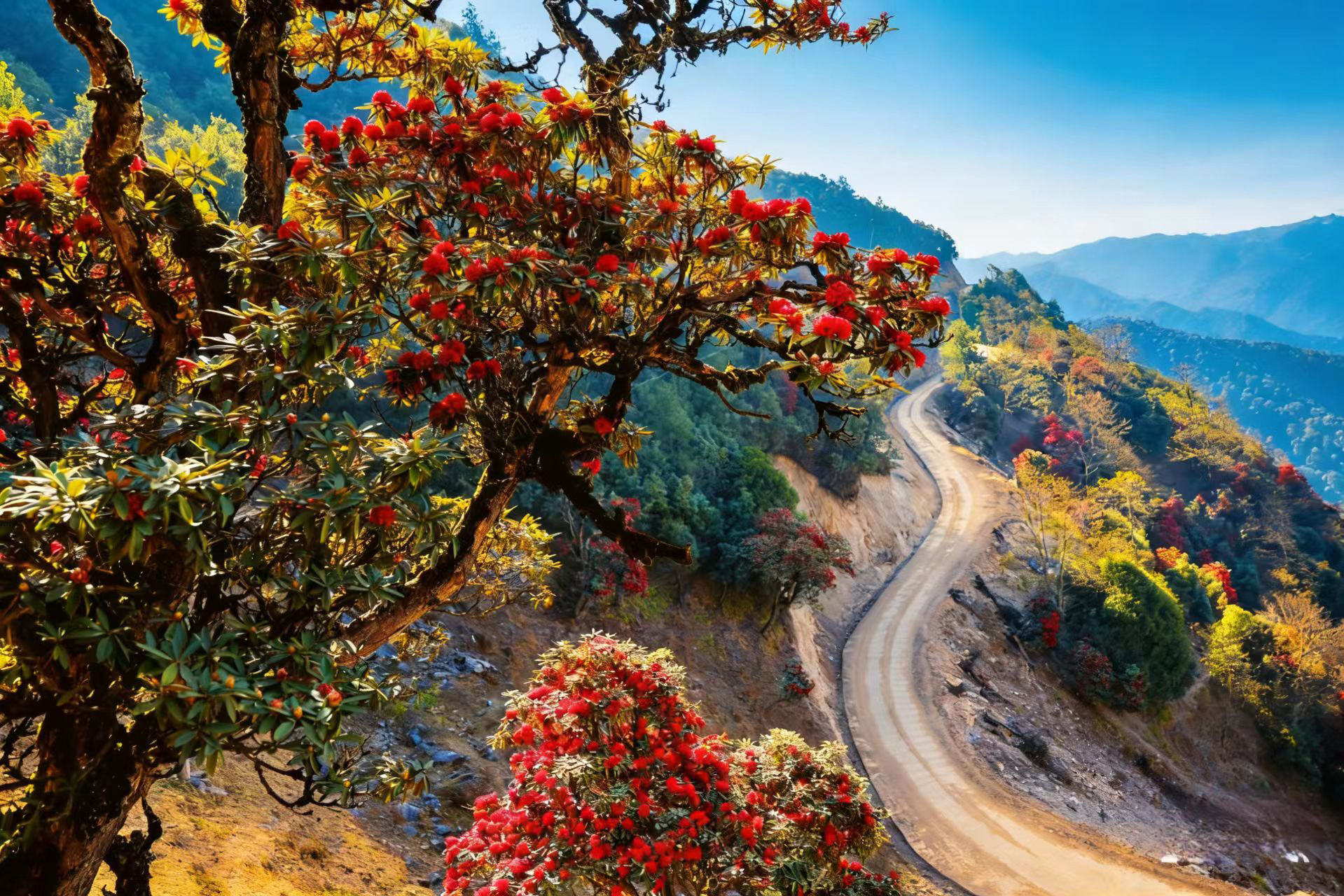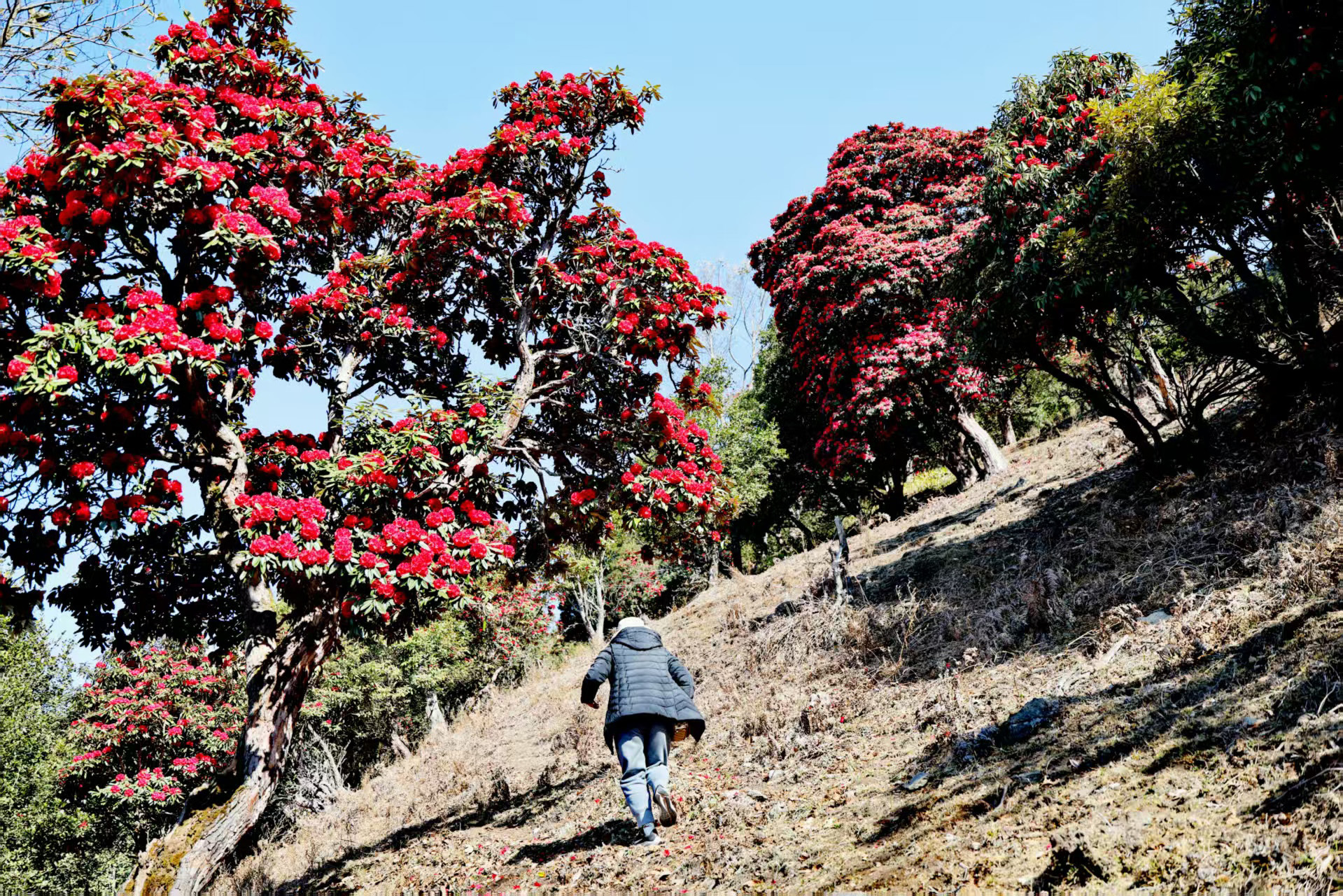 從埡口左側(cè)的水泥路順勢(shì)下行,無論是驅(qū)車緩行,還是信步漫游,不到一公里的路程,漫山遍野的杜鵑便猝不及防撞入眼簾。蒼勁的古樹枝干虬曲遒勁,承載著歲月的痕跡,枝頭綴滿層層疊疊的繁花,開得熱烈而肆意。山坡盡數(shù)被這緋紅的花潮浸染,遠(yuǎn)觀如天邊的云霞傾瀉而下,鋪就一片絢爛錦緞;近賞似團(tuán)團(tuán)烈焰燃遍山林,每一片花瓣都飽含生機(jī),將山野間最磅礴、最純粹的春意展現(xiàn)得淋漓盡致。