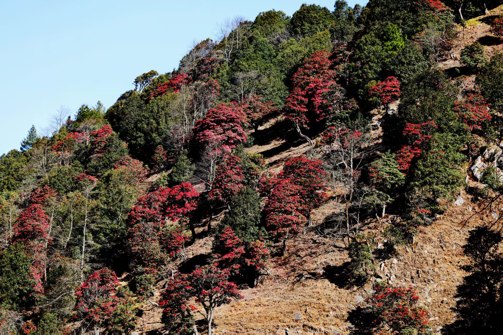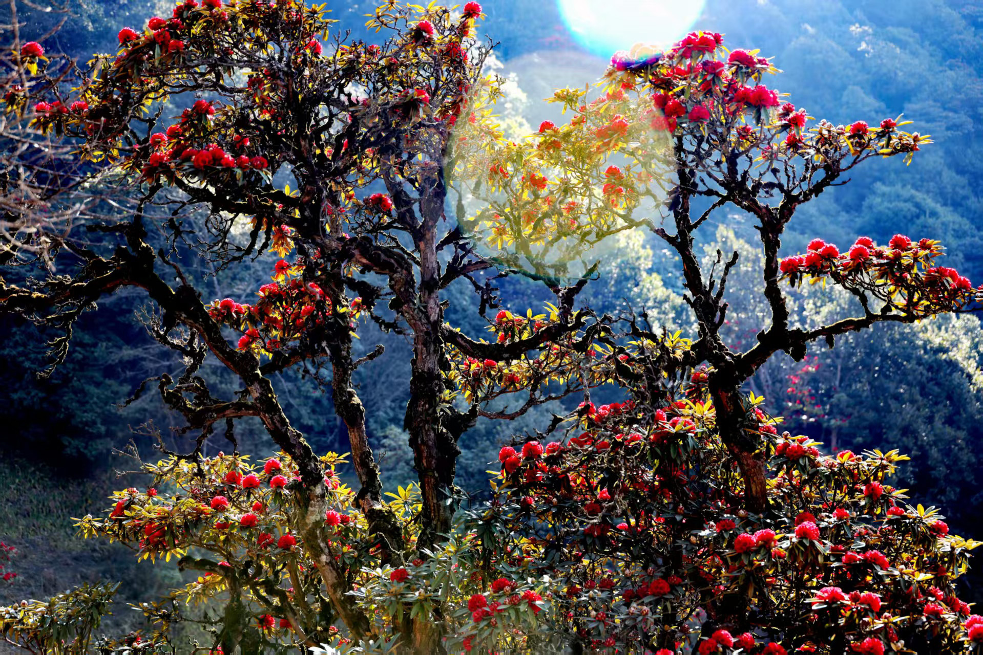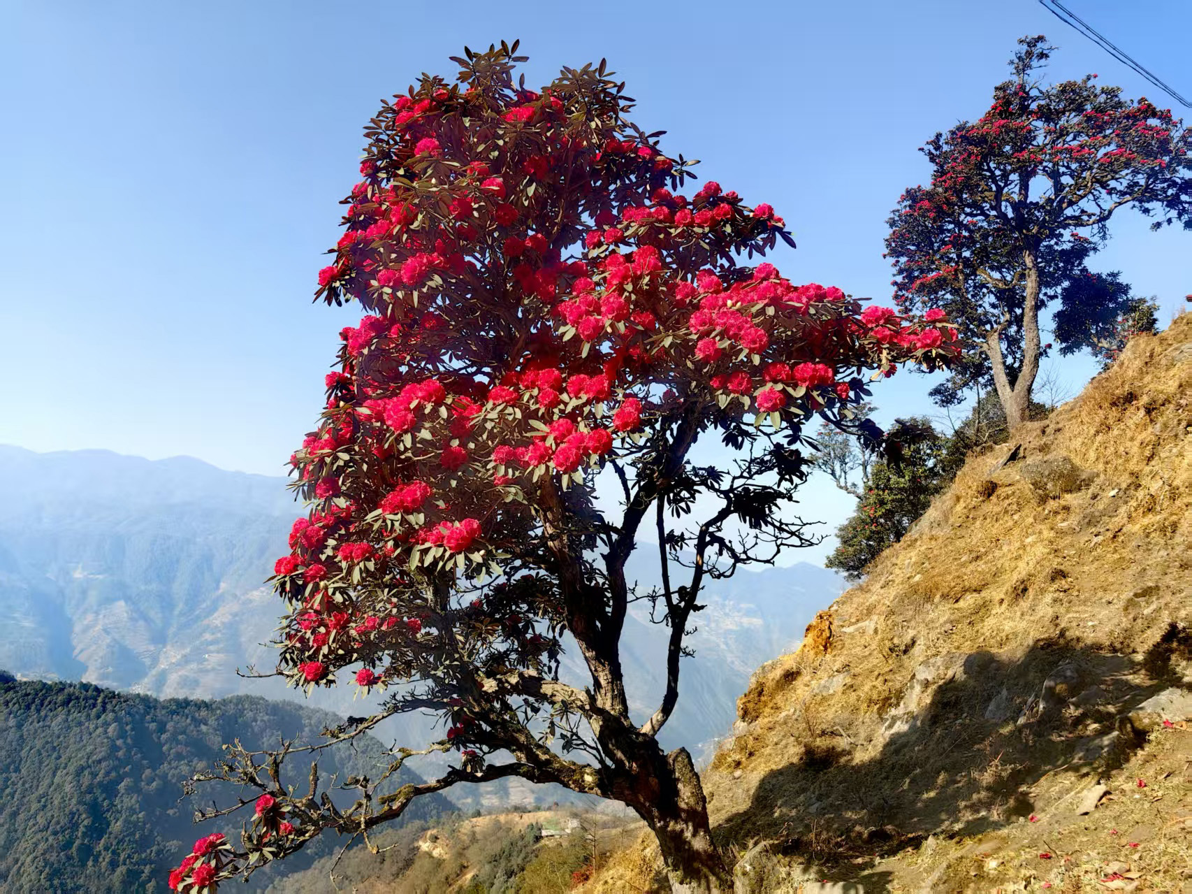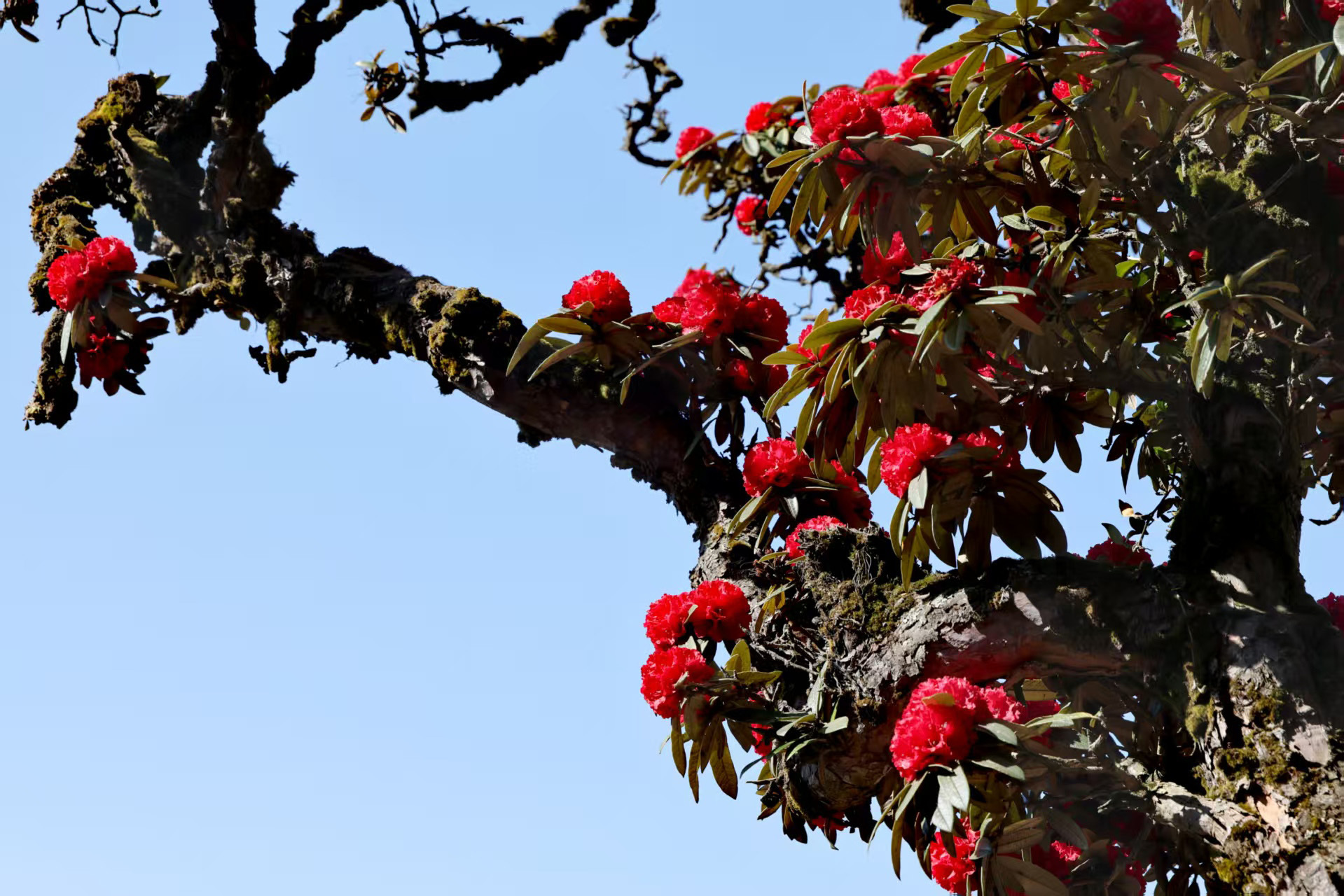 從埡口左側(cè)的水泥路順勢(shì)下行,無論是驅(qū)車緩行,還是信步漫游,不到一公里的路程,漫山遍野的杜鵑便猝不及防撞入眼簾。蒼勁的古樹枝干虬曲遒勁,承載著歲月的痕跡,枝頭綴滿層層疊疊的繁花,開得熱烈而肆意。山坡盡數(shù)被這緋紅的花潮浸染,遠(yuǎn)觀如天邊的云霞傾瀉而下,鋪就一片絢爛錦緞;近賞似團(tuán)團(tuán)烈焰燃遍山林,每一片花瓣都飽含生機(jī),將山野間最磅礴、最純粹的春意展現(xiàn)得淋漓盡致。