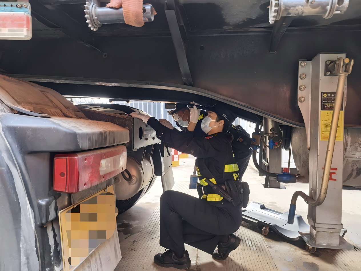 南傘口岸客貨車(chē)輛往來(lái)密集,每天數(shù)百輛貨車(chē)滿載著礦石、甘蔗、百貨穿行而過(guò),查緝?nèi)蝿?wù)繁重且復(fù)雜。面對(duì)車(chē)流如織的查驗(yàn)現(xiàn)場(chǎng),肖玉鞡從未因自己是女同志而退縮半分,始終勇挑重?fù)?dān)、沖鋒在前,面對(duì)地表溫度直逼四十度的環(huán)境,她攀上滾燙的車(chē)廂,鉆進(jìn)悶熱的車(chē)底,在彌漫著鐵銹與機(jī)油味的環(huán)境中,用女性特有的細(xì)致與敏銳,一寸一寸篩查著潛在的風(fēng)險(xiǎn)。