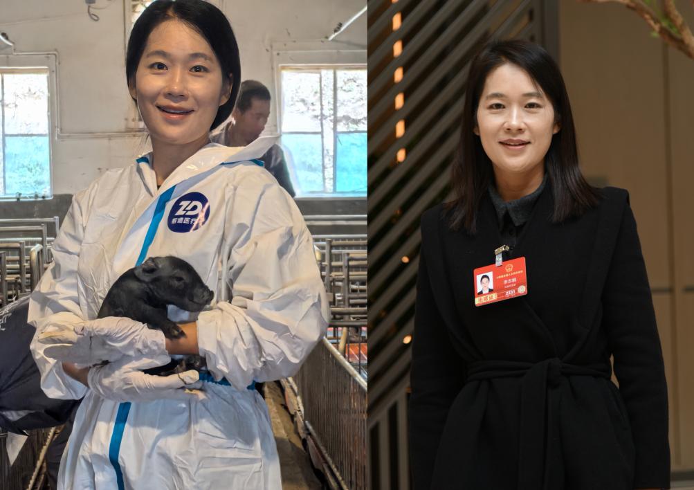 李志娟在養(yǎng)殖場(左,受訪者供圖);全國人大代表李志娟在云南代表團(tuán)駐地(右,新華社記者王賢思攝)。