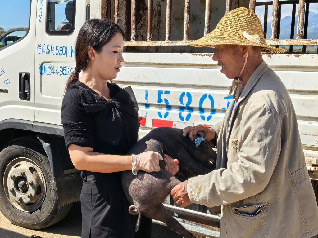 李志娟給當(dāng)?shù)卮迕癜l(fā)放黑豬種豬。(受訪者供圖)