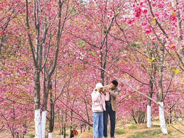 游客在櫻花谷打卡拍照。