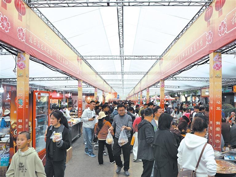 游客賞盡春日繁花,味蕾也亟待慰藉,櫻花谷外的美食街同樣熱鬧非凡,煙火氣十足。