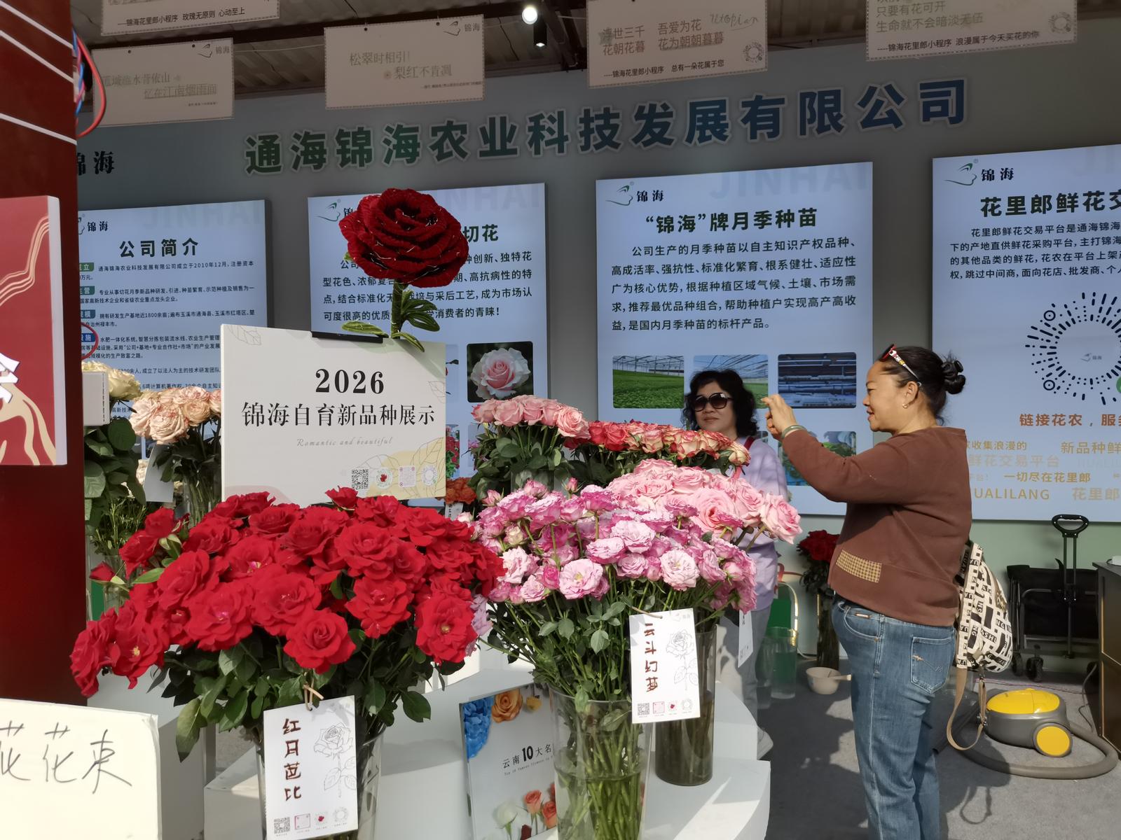 在錦海公司展位,珍珠芭比、紅月芭比、香芒起司、春日頌等自主研發(fā)玫瑰新品種集中展出。五彩斑斕的鮮花生機盎然,錯落有致的布置將展位裝點成浪漫雅致的花境,吸引眾多游客駐足觀賞、拍照選購。