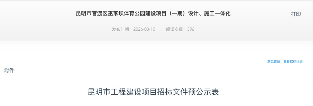 3月10日,云南省公共資源交易信息網(wǎng)發(fā)布《昆明市官渡區(qū)巫家壩體育公園建設(shè)項(xiàng)目(一期)設(shè)計(jì)、施工一體化》招標(biāo)文件預(yù)公示。