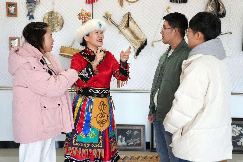 2023年2月23日,在黑龍江省同江市八岔赫哲族鄉(xiāng)八岔村伊瑪堪傳習(xí)所,劉蕾(左二)與年輕人交流。新華社記者 王建威 攝