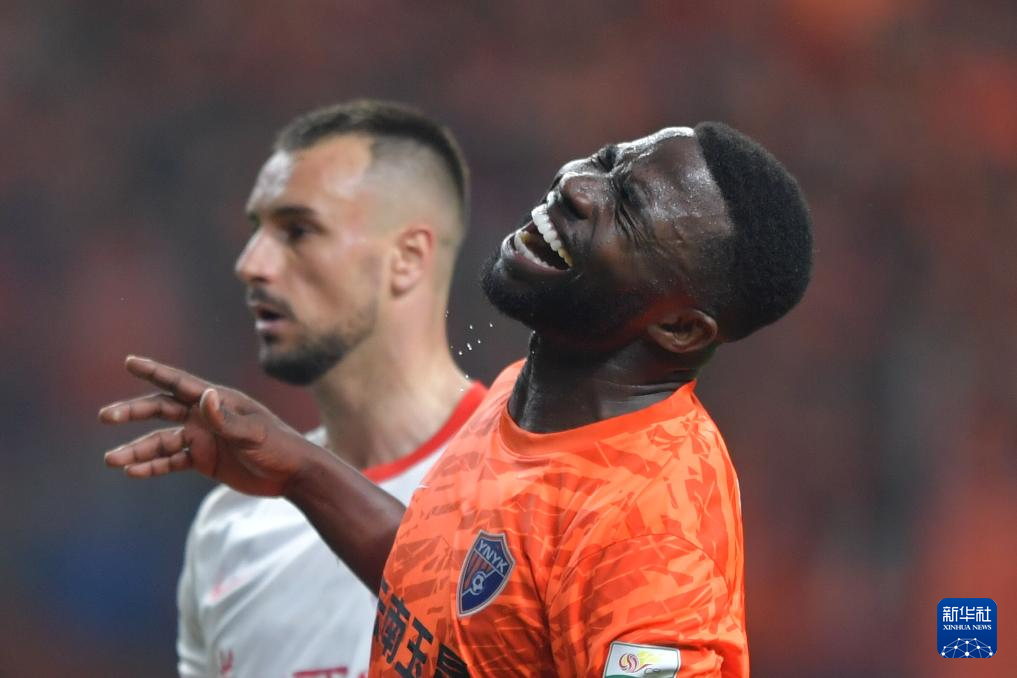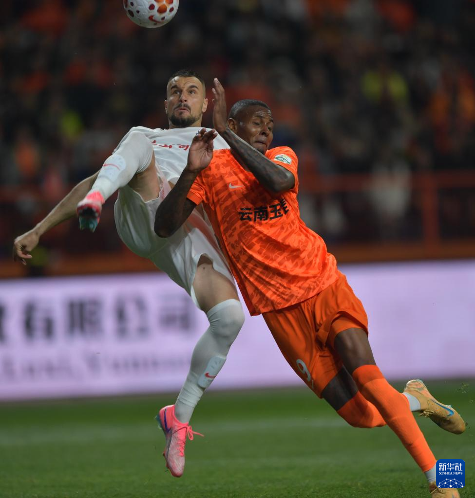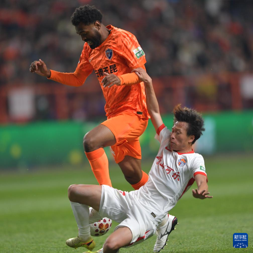 ??3月7日,云南玉昆隊(duì)球員克萊伯(右)與青島海牛隊(duì)球員安杰爾科維奇在比賽中拼搶。