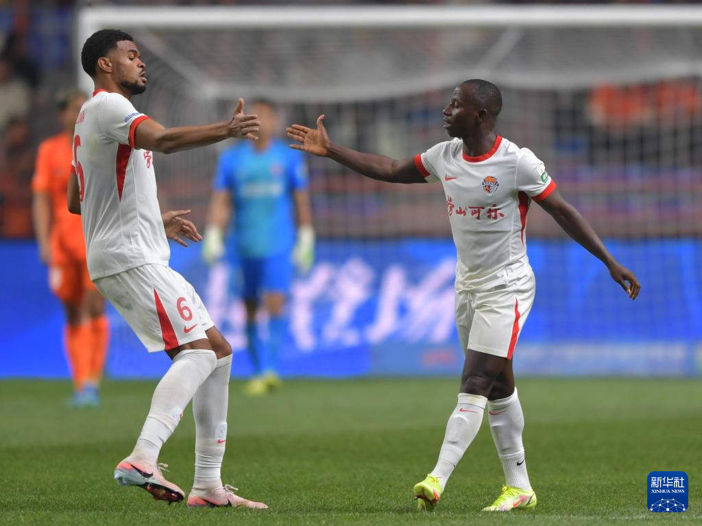 3月7日,青島海牛隊(duì)球員葉博亞(右)在比賽中與隊(duì)友慶祝進(jìn)球。