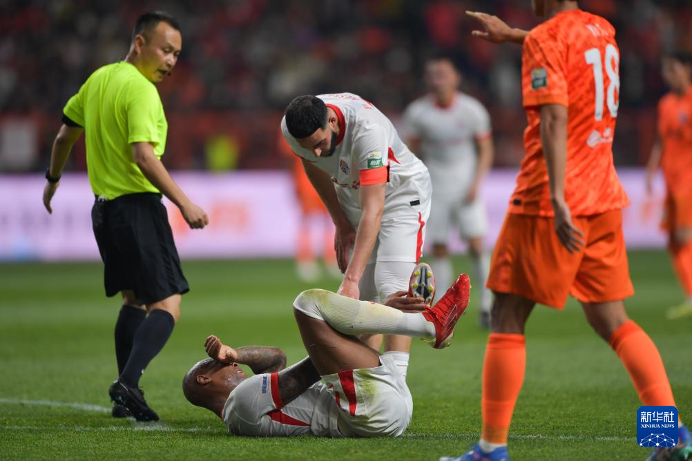 3月7日,青島海牛隊(duì)球員斯特蘭德貝里(下)在比賽中摔倒。