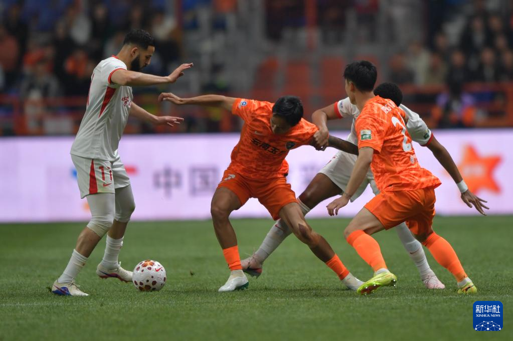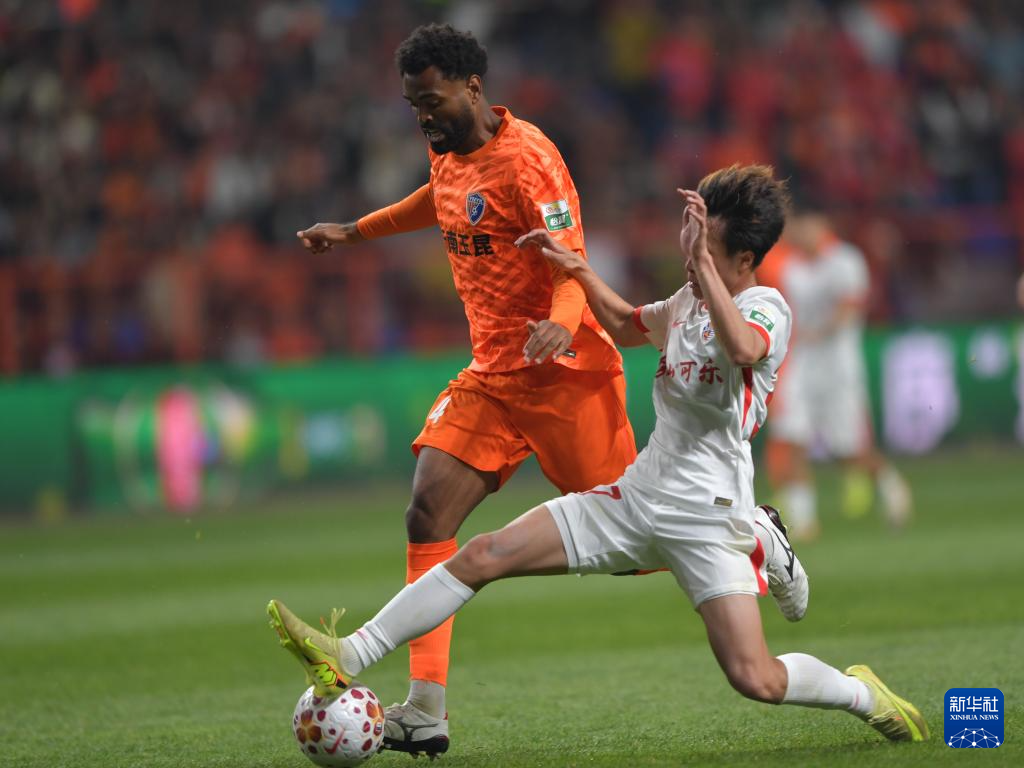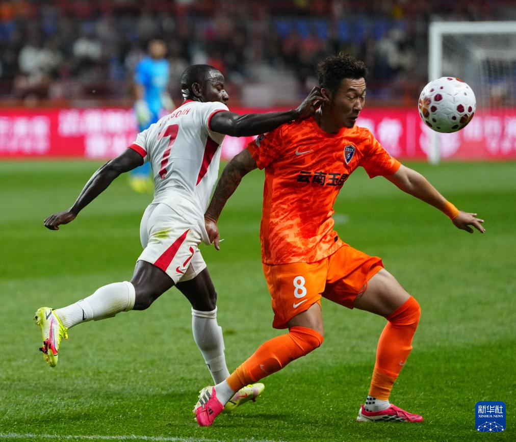 3月7日,云南玉昆隊(duì)球員徐新(右)與青島海牛隊(duì)球員葉博亞在比賽中拼搶。