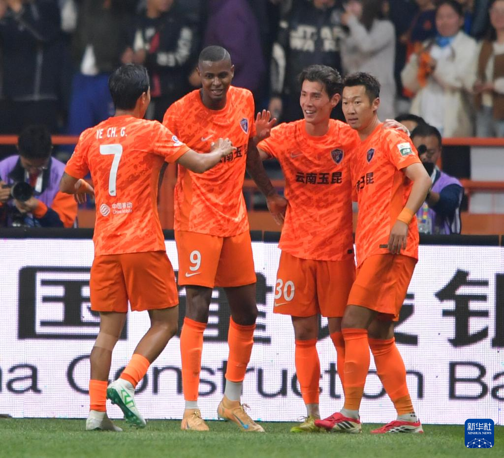 3月7日,云南玉昆隊(duì)球員在比賽中慶祝進(jìn)球。