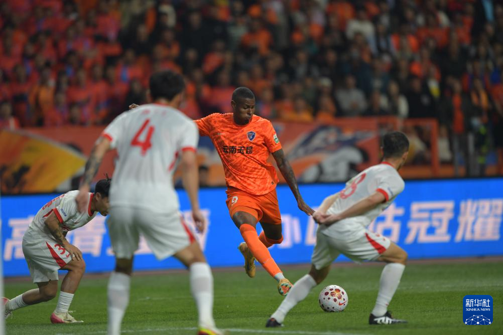 3月7日,云南玉昆隊(duì)球員克萊伯(右二)在比賽中射門。
