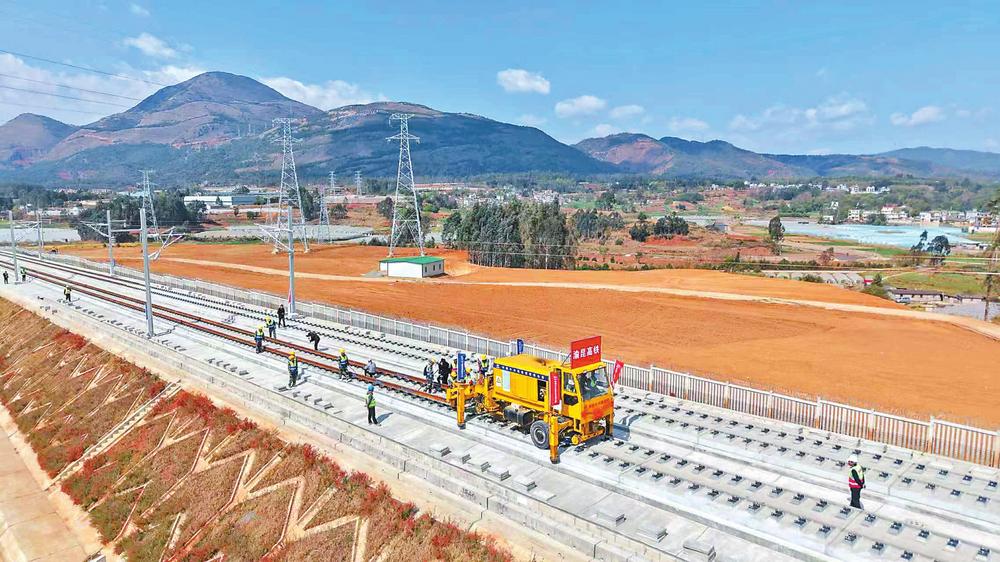 3月18日,渝昆高鐵昆明往重慶方向的鋪軌施工在位于嵩明縣的昆明崔家莊鋪軌基地正式啟動。