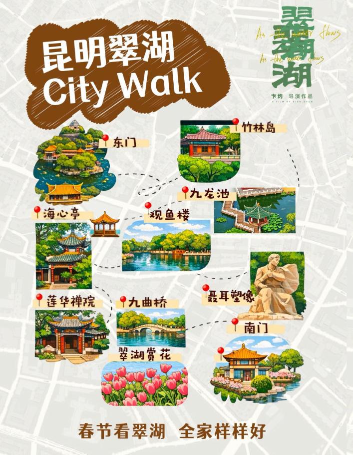 圍繞本土影片《翠湖》,五華區(qū)策劃了一系列全鏈條活動,讓電影從銀幕走向城市街巷。在1月16日的南屏街首映禮上,發(fā)布“跟著《翠湖》游五華”“電影+票根聯(lián)動”“銀齡關(guān)懷”等活動,打響預(yù)熱“第一槍”。在翠湖公園舉辦的“跟著《翠湖》游翠湖——賞花?觀影?過大年”電影賦能文旅消費融合活動,以“一湖兩點三線”形式開展主創(chuàng)快閃、影迷交流、文創(chuàng)互動等,現(xiàn)場發(fā)布“跟著《翠湖》游翠湖”citywalk地圖,影迷憑《翠湖》票根可領(lǐng)取獨家周邊。聯(lián)動推出“《翠湖》×翠湖”文創(chuàng)雪糕、“翠湖×麻園”共創(chuàng)等文創(chuàng)產(chǎn)品,翠湖公園、翠湖咖啡文化中心、南屏商圈迅速成為春節(jié)期間最熱門的網(wǎng)紅打卡地,實現(xiàn)了電影與城市的雙向奔赴。